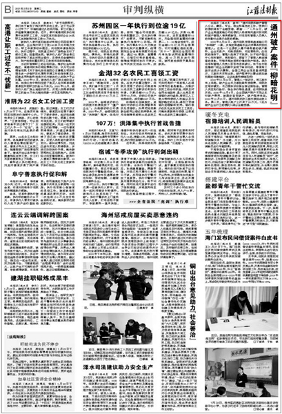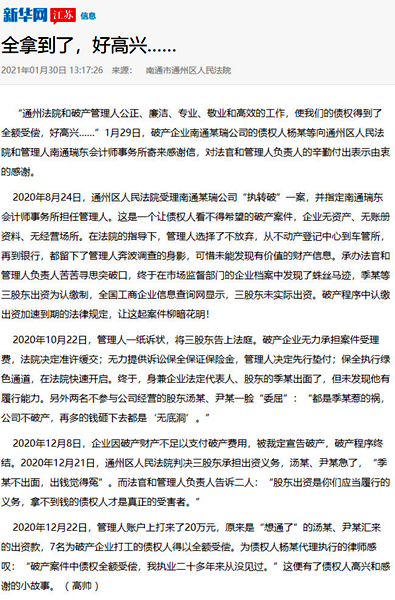 江蘇法制報截圖 近日“南通瑞東會計師事務所”的名字,不斷出現(xiàn)在《新華網》《江蘇法制報》的報道之中。一個小會所名字出現(xiàn)到主流新聞媒體中,實屬罕見。這要從我所承辦的一起破產案件說起。 2020年8月24日,通州區(qū)人民法院受理南通某瑞公司“執(zhí)轉破”一案,并指定南通瑞東會計師事務所擔任管理人。這是一個典型的企業(yè)無資產、無賬冊資料、無經營場所的三無企業(yè),債權人看不到任何受償希望的破產案件。 南通瑞東會計師事務所由多名專業(yè)人員組成的清算組,主任會計師吳林海親自帶隊。在承辦法院的指導下,管理人從不動產登記中心到車管所,再到銀行,四處奔波,全方位開展資產調查工作,可惜仍未能發(fā)現(xiàn)有價值的財產信息。管理人團隊苦苦尋思突破口,仔細尋找蛛絲馬跡,終于在稅務局申報表和市場監(jiān)督部門的企業(yè)檔案中發(fā)現(xiàn)了有益線索。原來債務人公司季某等三股東出資為認繳制,全國工商企業(yè)信息查詢網顯示,三股東均未實際出資。根據企業(yè)進入破產程序股東認繳出資加速到期的法律規(guī)定,讓這起案件柳暗花明! 2020年10月22日,管理人一紙訴狀,將三股東告上法庭在申請訴訟保全后,債務人企業(yè)無力提供訴訟保全保證保險金的情況下管理人毅然決然決定有管理人機構自己先行墊付,申請法院進行了保全保全。終于,身兼企業(yè)法定代表人、股東的季某出面了,但未發(fā)現(xiàn)他有履行能力。另外兩名不參與公司經營的股東湯某、尹某一臉“委屈”:“都是季某惹的禍,公司不破產,再多的錢砸下去都是‘無底洞’。但是法律是公正的,2020年12月21日,通州區(qū)人民法院判決三股東必須承擔出資義務。管理人負責人告知被告“股東出資是你們應當履行的義務,拿不到錢的債權人才是真正的受害者!逼扔诜傻耐Γ2020年12月22日,“想通了”的湯某、尹某向管理人賬戶打來了20萬元,最終, 7名打工人員全額拿回血汗錢! “破產管理人專業(yè)、敬業(yè)和高效的工作,使我們的債權得到了全額受償,好高興……”1月29日,破產企業(yè)南通某瑞公司的債權人楊某等向管理人南通瑞東會計師事務所寄來感謝信,對管理人的辛勤付出表示由衷的感謝。 為債權人楊某代理執(zhí)行的律師感嘆:“破產案件中債權全額受償,我執(zhí)業(yè)二十多年來從沒見過! 盡職、盡力、盡心、盡我所能,維護債權人的利益、維護法律的權威這是南通瑞東會計師事務所作為破產管理人一貫堅持的基本原則。所承辦案件得到債權人的認可,得到法院的肯定,這是管理人的最大榮譽。 |